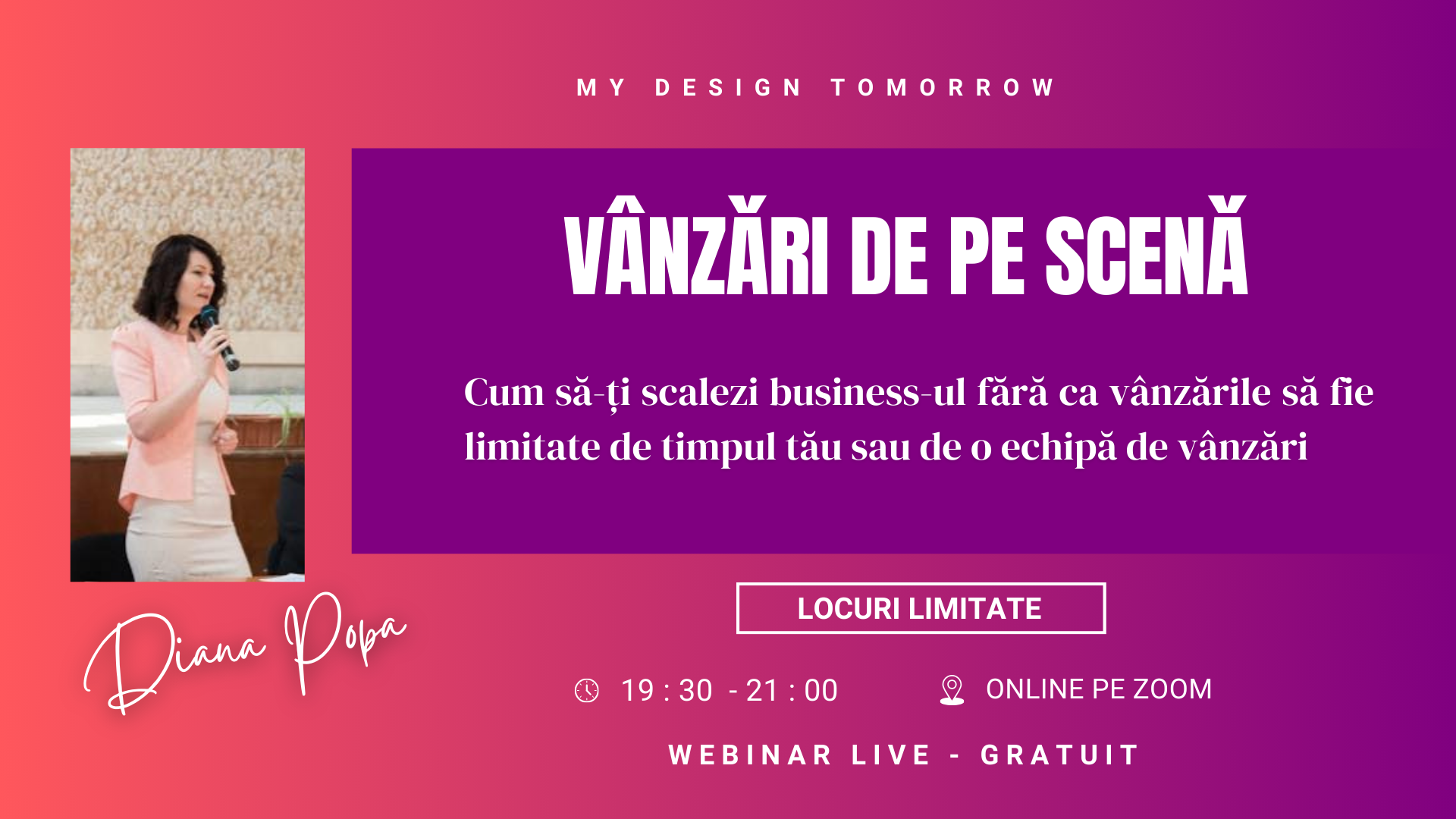 În webinarul „Vânzare de pe scenă”, îmi propun să îți ofer claritate asupra modului în care poți scala business-ul tău prin vânzare de grup, fără să renunți la autenticitate, fără să îți sacrifici timpul și fără să construiești structuri care nu te reprezintă.
